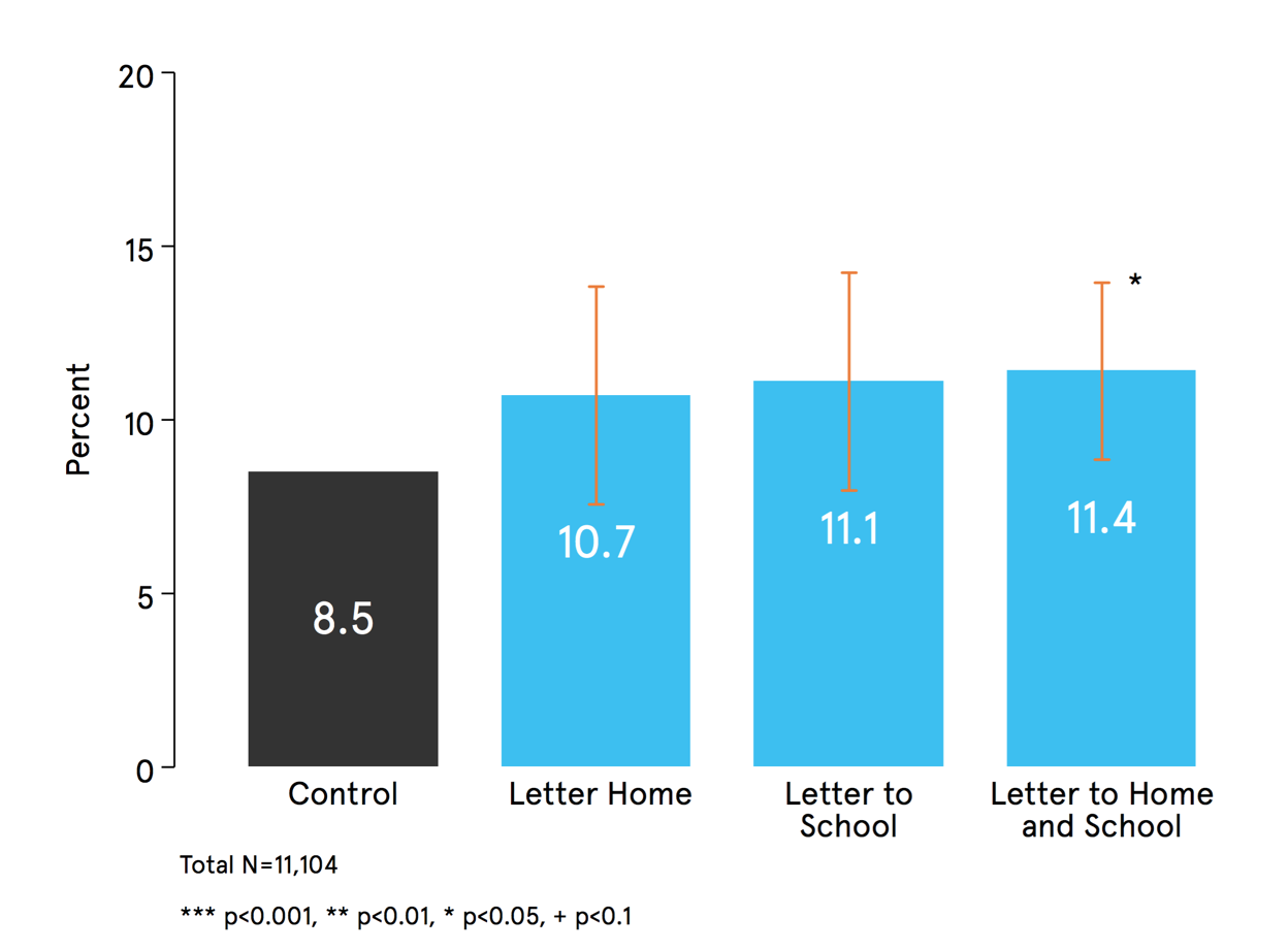 Those who received both letters were 3.3 percentage points more likely to apply to a Russell Group university and 2.9 percentage points more likely to accept an offer from a Russell Group university than students in the control group. We estimate that as a result of the trial an extra 222 students will have gone to a Russell Group university compared to if everyone had been in the control condition. This was achieved at a cost of just £45 per additional student.