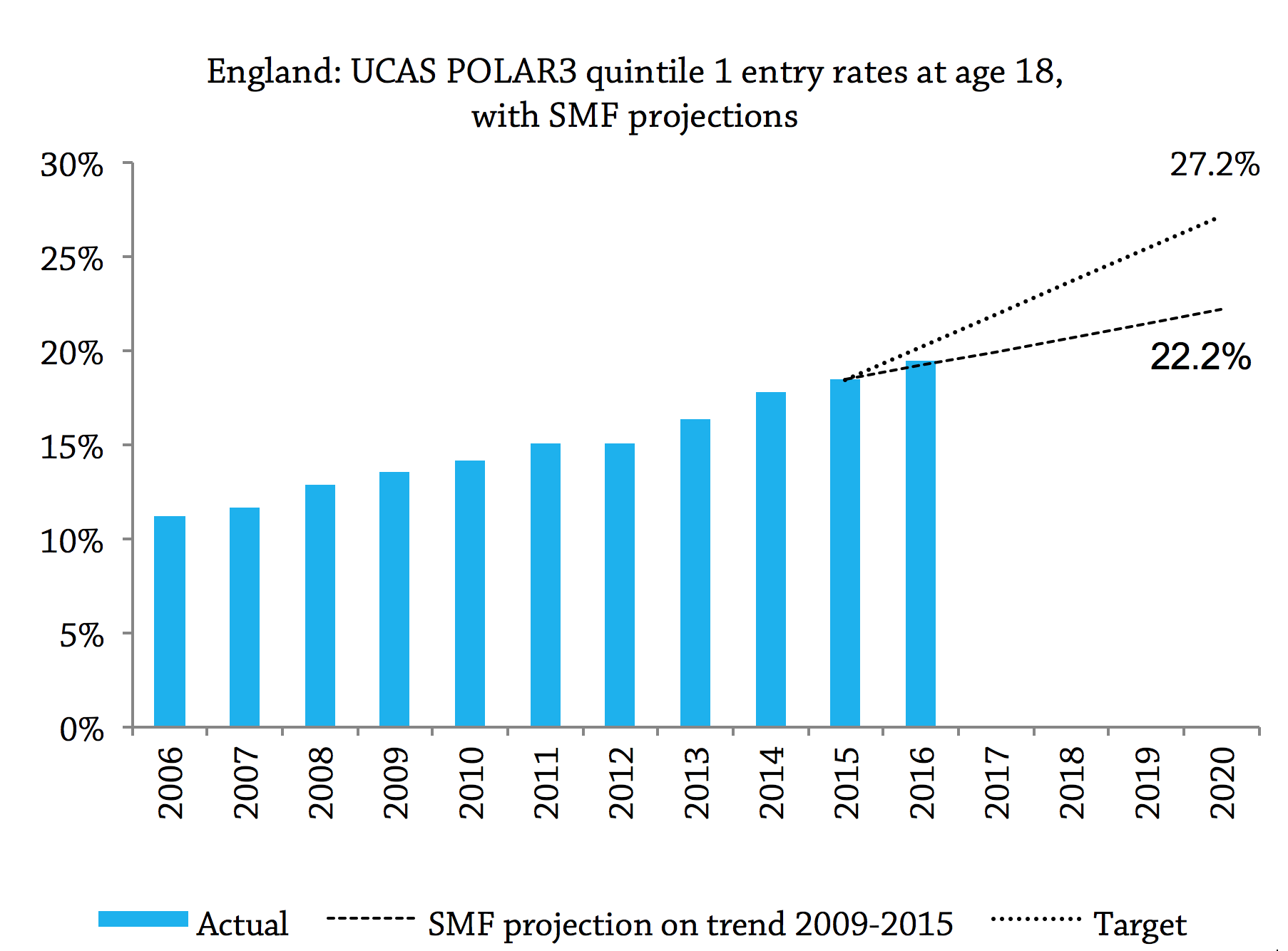 In England, the government has announced that by 2020, it wants to double the proportion of pupils from disadvantaged backgrounds entering higher education, compared to 2009. Using the entry rate through UCAS for 18 year olds as a proxy for this, the Social Market Foundation last year calculated that this would require an increase in the entry rate from 18.5% in 2015 to 27.2% in 2020. It argued that the system’s steady but slow rise was heading instead towards a position 5 percentage points below that by 2020.