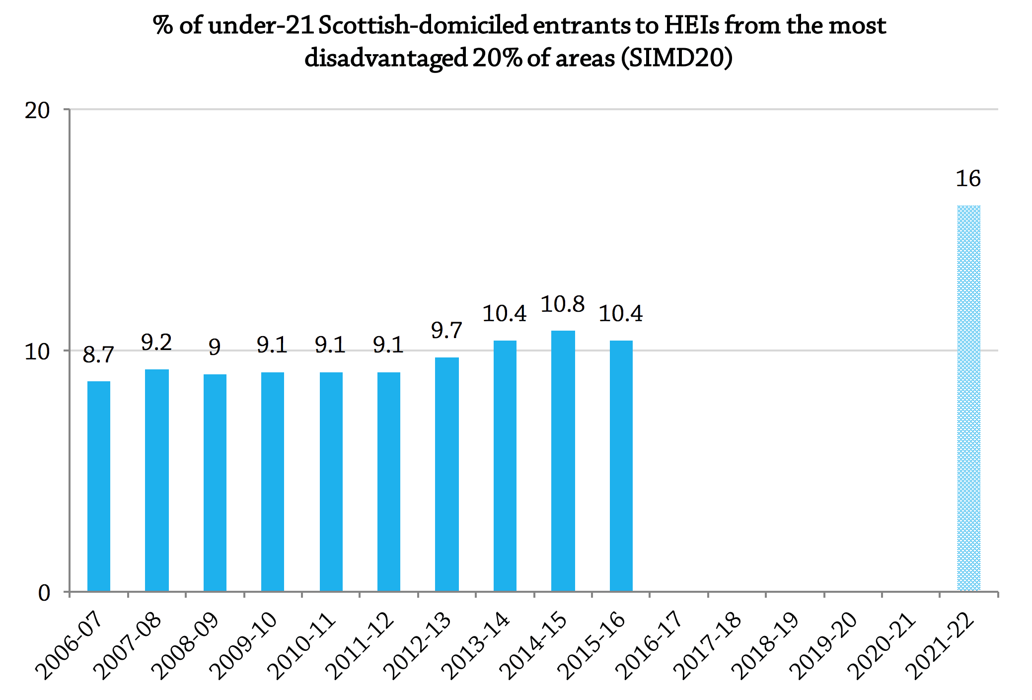 - By 2021, students from the 20% most deprived backgrounds should represent at least 16% of full-time first degree entrants to Scottish HEIs as a whole.