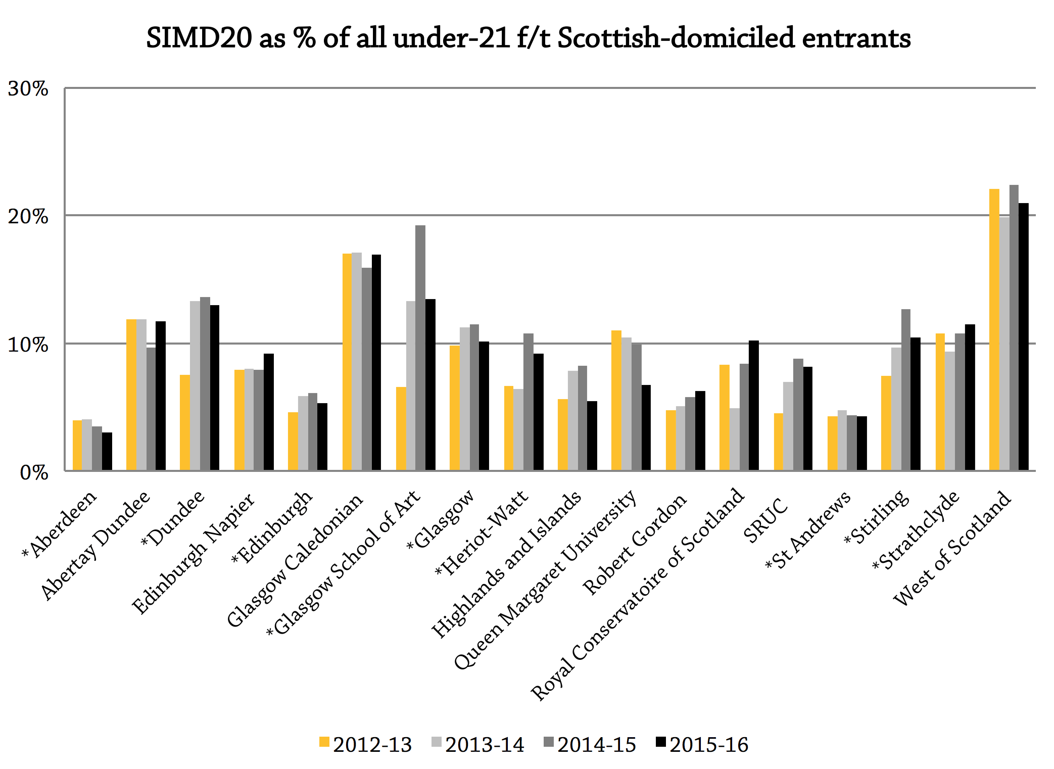 Here the numbers released last week by the Scottish Funding Council are particularly useful. They provide the nearest thing we have to a statistic measuring its focus: the percentage of all undergraduate entrants to universities/HEIs from the most disadvantaged areas.