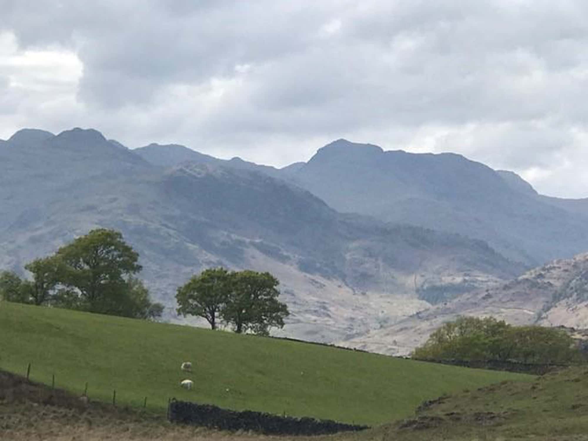“take this view of a much wilder scene – against the sky, Bowfell, the majestic mountain. In the foreground a windswept hillside to which the trees seem to cling in hope. This too is a managed landscape, not just the drystone wall and fence in the foreground but the distant hillsides. Were the sheep (and sheep farmers) to vanish, the view would look utterly different.” – Michael Barber, 23rd June 2017