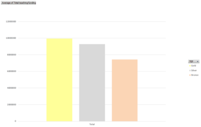 On teaching funding, the average amount (in £) of HEFCE funding by institution is slightly larger for gold than it is for silver, but there is a big drop between silver and bronze. As HEFCE funding is concentrated in lab sciences, medicine and some smaller subjects, this offers us some hints about the subject mix that appears to do better in TEF.