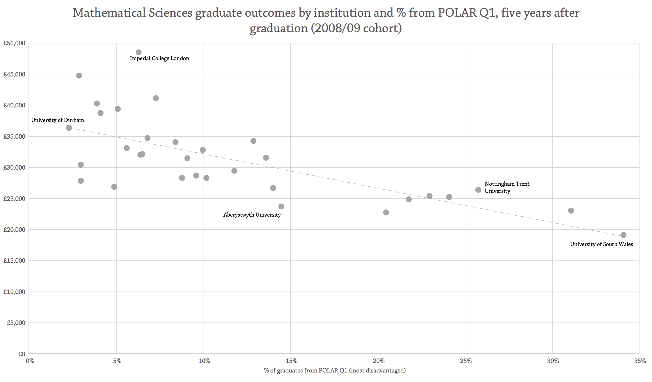 For example, Mathematical Sciences sees a mean gap of £12,640 in three-year graduate median earnings between those courses that admit the most POLAR quintile 1 (most disadvantaged) students and those that admit the least.