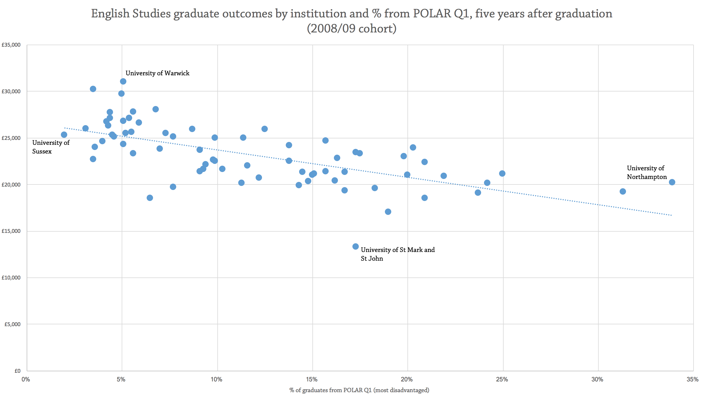 Meanwhile, English Studies has a much smaller gap of (only) £2860 in three-year graduate median earnings between those courses that admit the most POLAR quintile 1 (most disadvantaged) students and those that admit the least. We can see from this graph (for data five years after graduation) that the trend line is a little less steep.