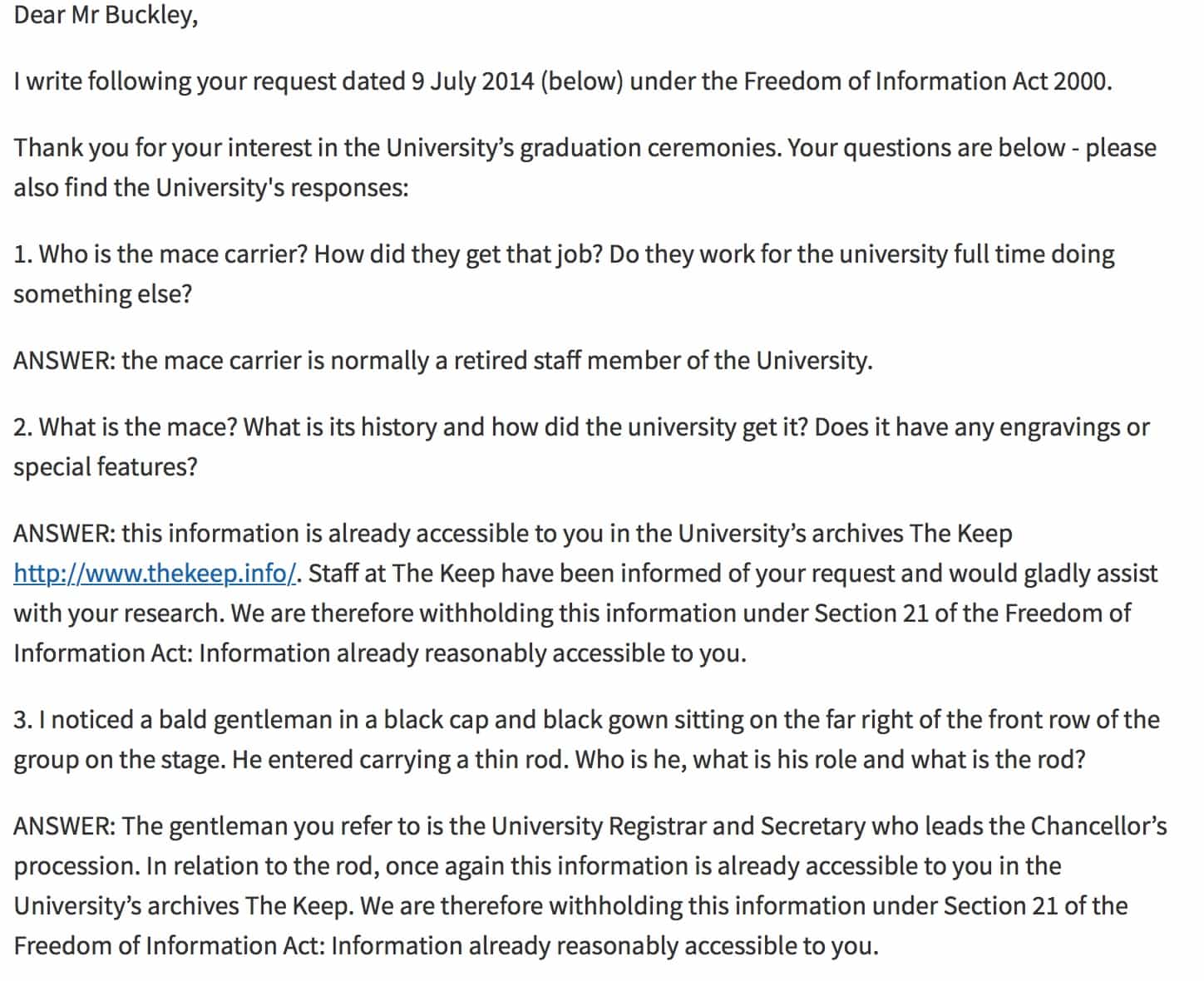There are many rituals associated with graduations which are largely inexplicable to most participants. Some people do though need answers to the big questions about graduation as this FOI to the University of Sussex demonstrates:
