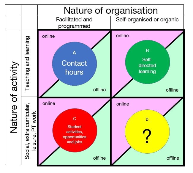 I do though have some hope and a vague idea of a solution. First, in principle, we should start gearing the working groups and the problem solving around understanding students (and staff) lives. We’ve spent years concluding that “lived experience” matters. Surely by asking ourselves (or even, god forbid, students) “how will students with particular characteristics or on particular courses spend their week” we’ll get better answers than we have now by September.