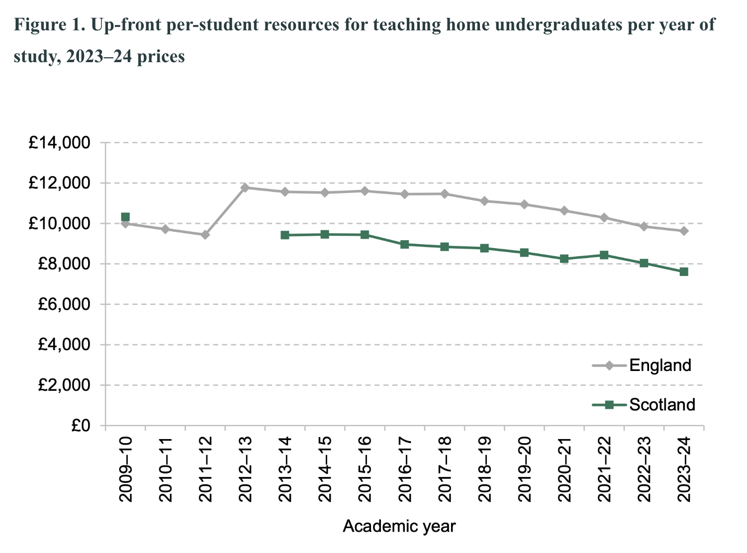 Last week the IFS said that funding for teaching had already fallen by 19 per cent since 2013-14, hovering as it does at around £2,000 less per student than is available for an English university teaching an England-domiciled undergraduate in 2023–24.