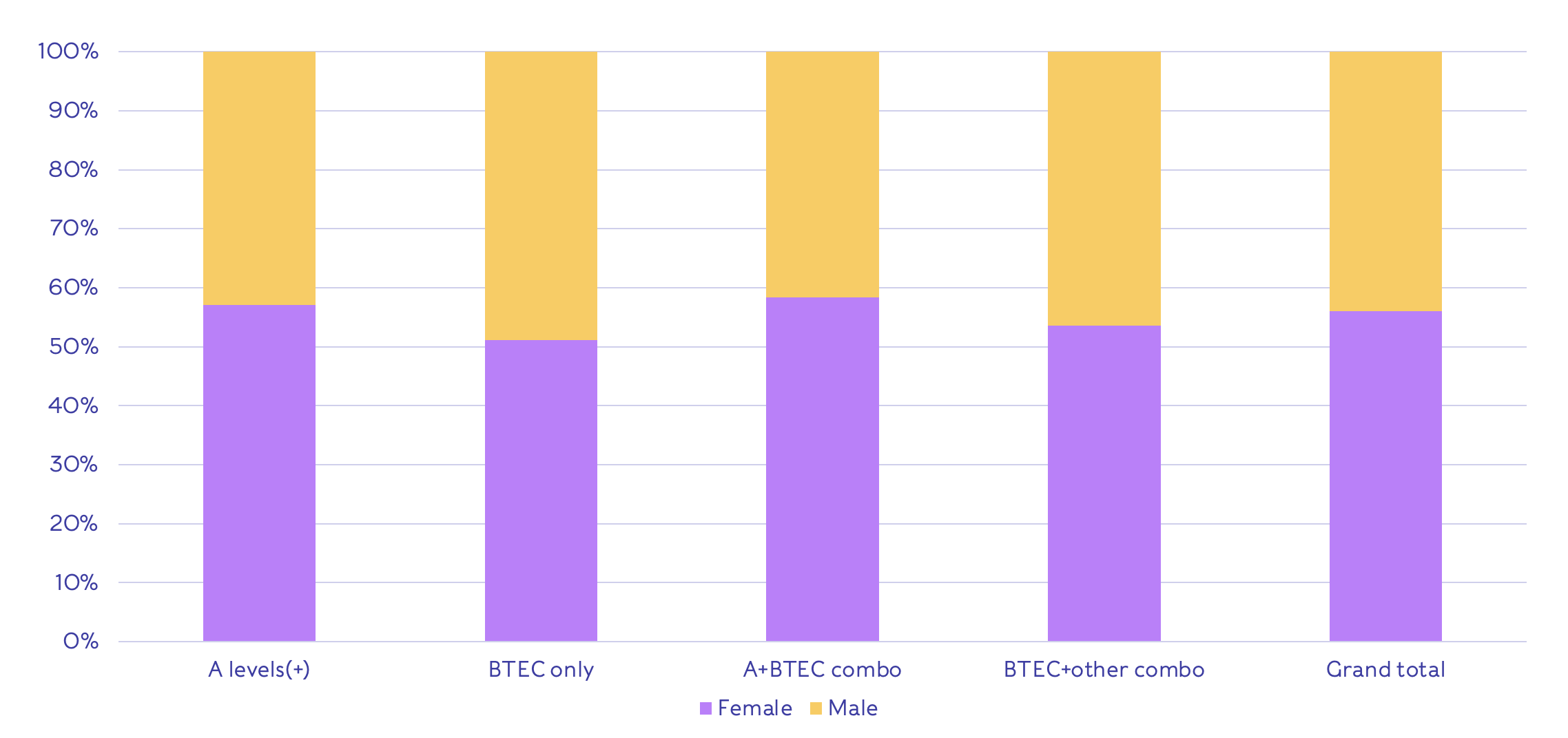 With men already significantly under-represented in higher education, the defunding of BTECs and other applied qualifications will worsen the gender gap. The whole population of English undergraduate recruits is around 44:56 male to female. Recruits holding BTECs are 49:51 male to female, as seen in the table below.