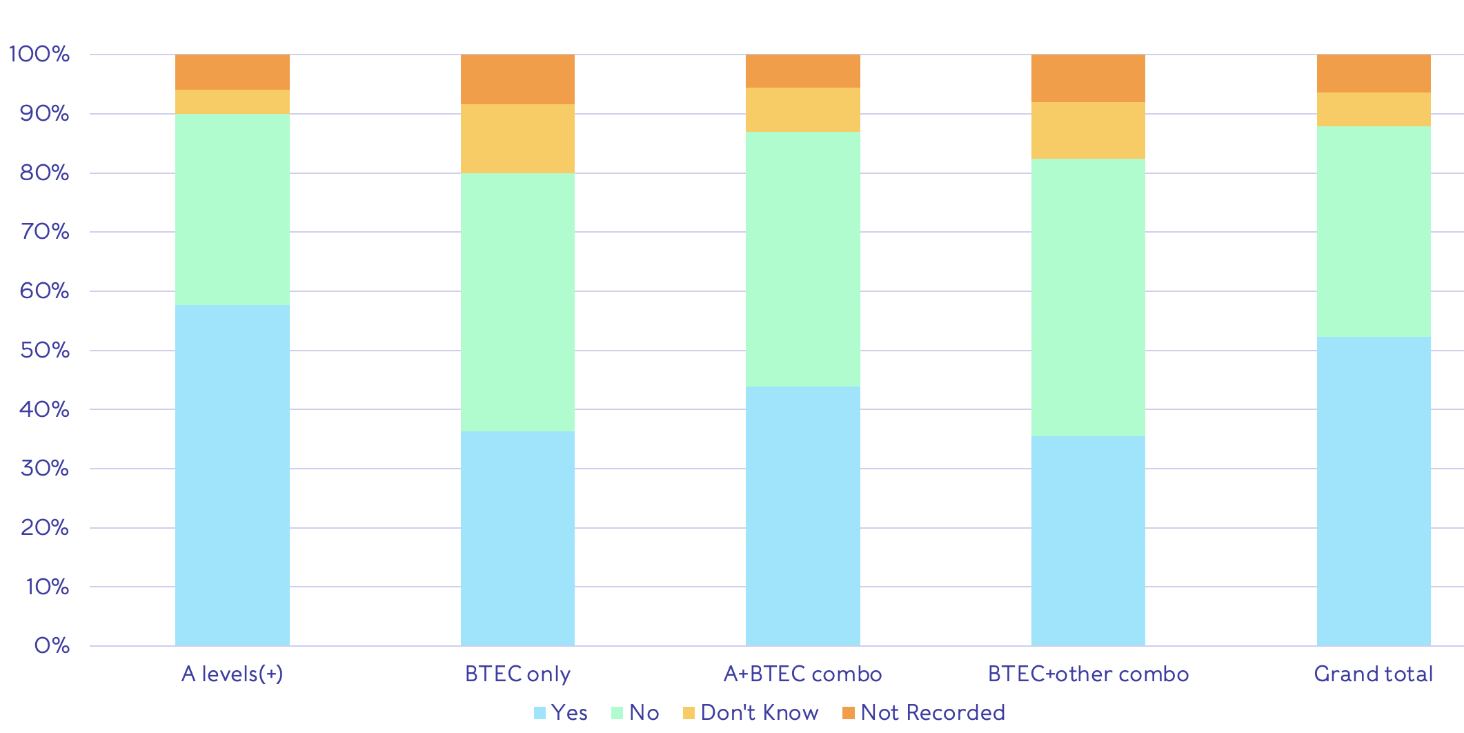 Just 1.3 per cent or c.4,000 English-domiciled students with a flag for care experience were recruited to HE through UCAS in 2022. A much higher proportion of these students is likely to hold BTECs than non-care experienced students.