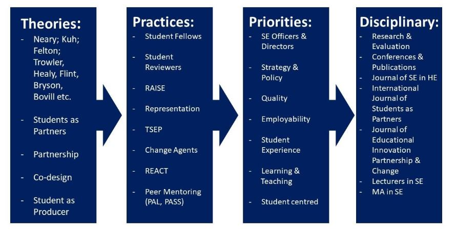 When we look back over the 15-20 years, the idea of focusing on student engagement began with theories and ideas, by scholars such as George Kuh, Mike Neary, Alison Cook-Sather and Colin Bryson, who encouraged the HE sector to work with students as partners, to place students at the centre of everything we do to improve engagement in learning.