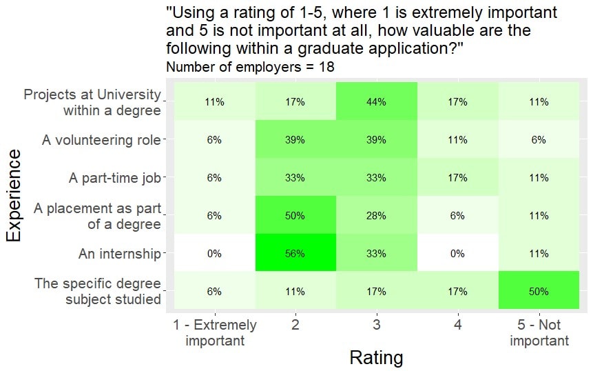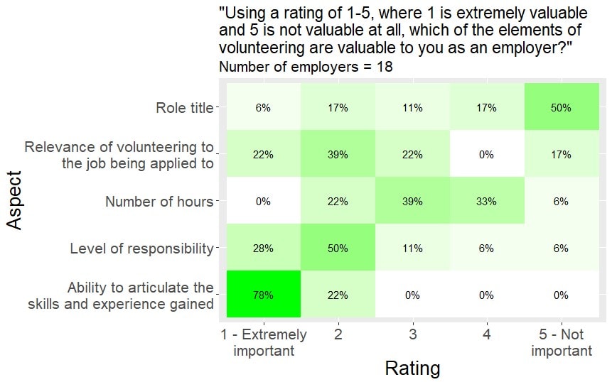 Employers rated the importance of volunteer experience similarly to other forms of work experience. However, internships and placements were generally considered to be more important.