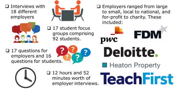 This project was conducted between November 2018 and May 2019 and investigated employer and student perspectives of various aspects of volunteering and employability including comparisons with other forms of work experience, different aspects of volunteering, volunteer recognition schemes, and common assumptions. An outline of the project can be seen in the infographic below: