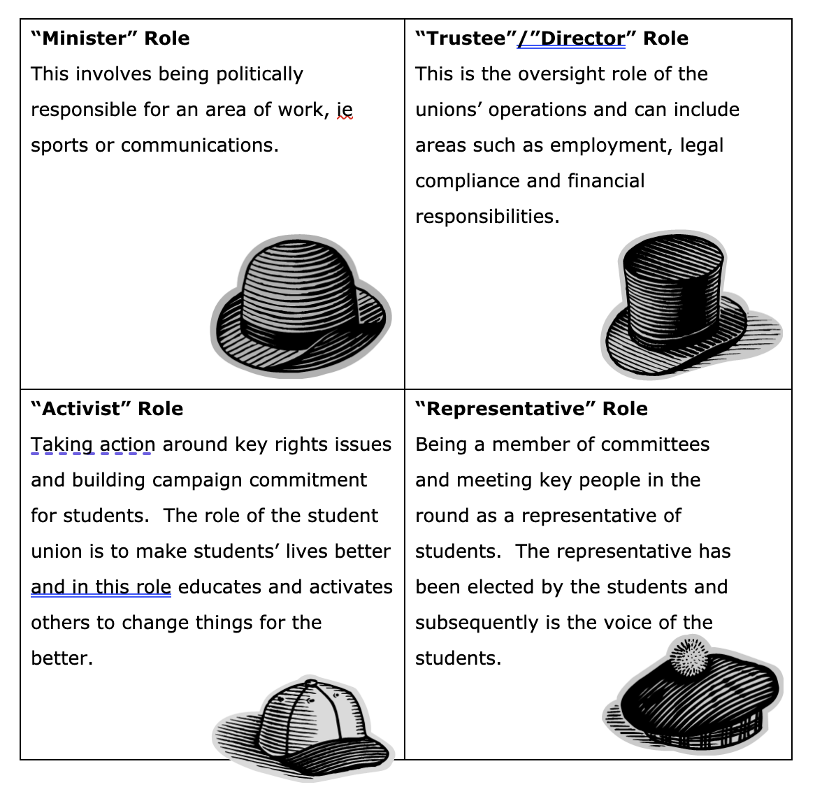 In the former our officer may need skills in analysis and political management. In the latter they’ll need skills in facilitation and interviewing students to get views from them. The “hats” are different, they serve a representative role but are completely different shapes.