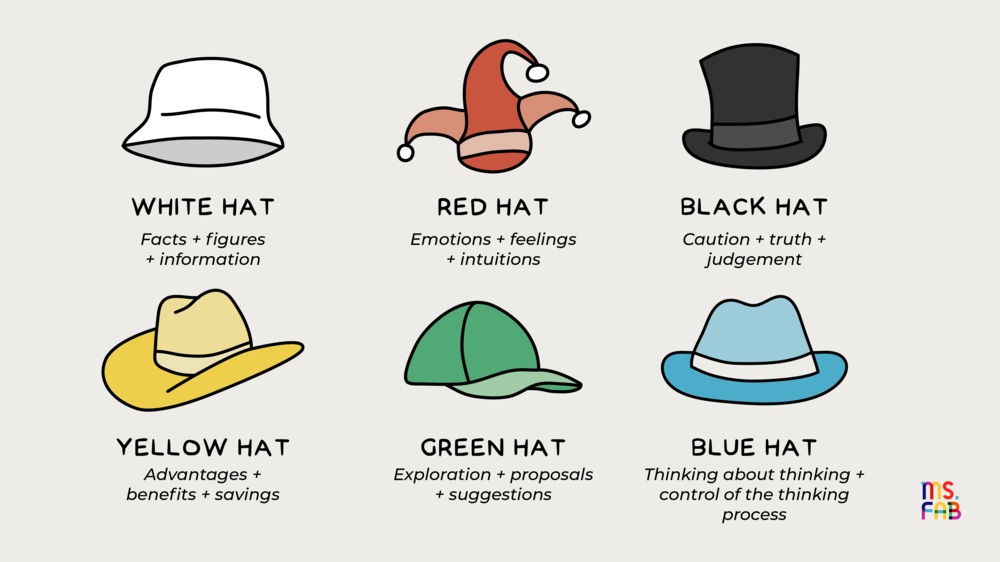 The idea was a simple one. Riffing off Edward De Bono’s Six Thinking Hats, the theory was that new officers don’t immediately appreciate the complexity of the role. Exercises invite new officers to both consider the sorts of activities that might be undertaken when wearing each hat, and the way in which a particular objective might be pursued or need to be considered when wearing each hat.
