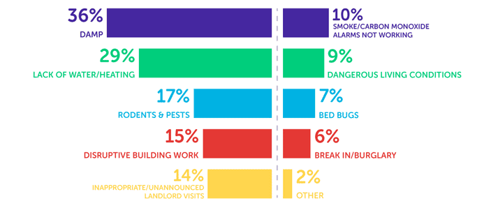 Damp is the issue that students are most likely to have with their house or flat. In the 2022 survey, 26% of students said they’d had issues with damp, but this has increased to 36% in this survey.