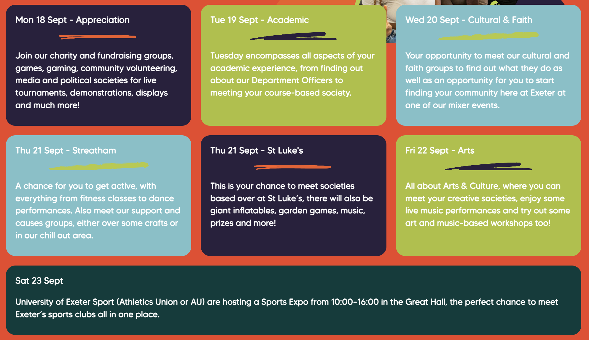 - Wed 20 Sept – Cultural & Faith: This is students’ opportunity to meet cultural and faith groups to find out what they do as well as an opportunity for students to start finding their community here at Exeter at one of our mixer events.