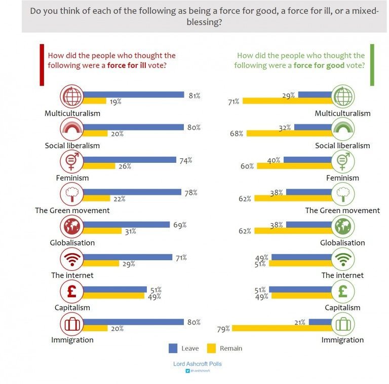 If we take the “leave/remain” split and look at where each group sits on a range of major issue, the “values” split is there to see: