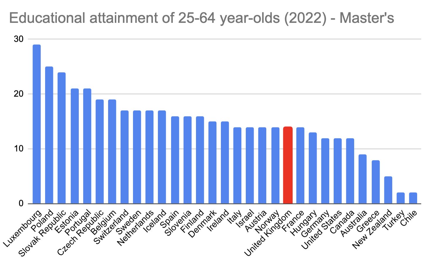 Even if we just take highest qualification in the population, in 2022, across the OECD, the UK was languishing near the bottom – and it’s doubtful that that’s about a lack of ambition: