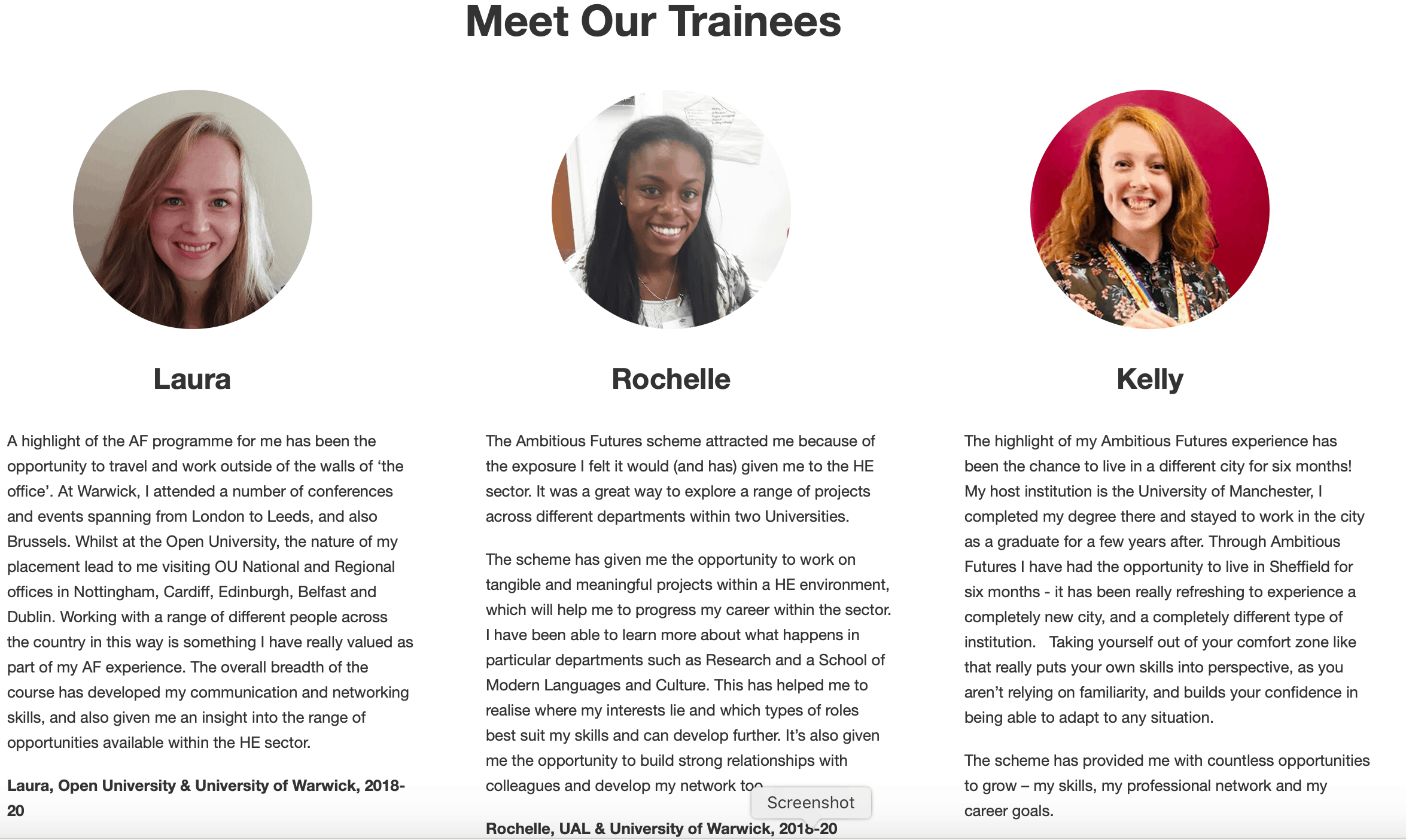 Recruitment for the next cohort of trainees is now open so if you are looking for a first class foundation for a graduate career in professional university management then apply here now. Being part of Ambitious Futures helps the sector to retain the best graduate talent. It confirms your University as a forward thinking employer and an excellent place to work.