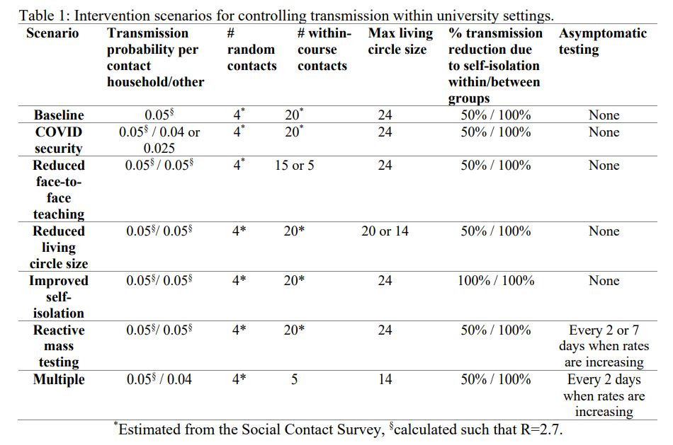 The modelling paper notes that a number of studies have investigated the challenges of reopening campuses, but have looked at fairly isolated campus universities in the US, rather than the more common civic-integrated universities that we have in the UK and elsewhere. It also notes the lack of “realistic mixing patterns” within a university setting that drive transmission in those models.
