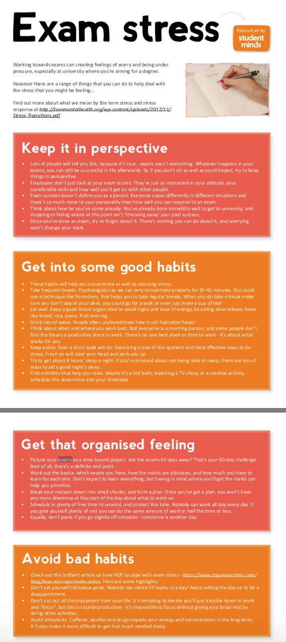 Leaving aside alpacas and bubble wrap the most sensible advice on exam stress and sources of advice and support remains the Student Minds website.