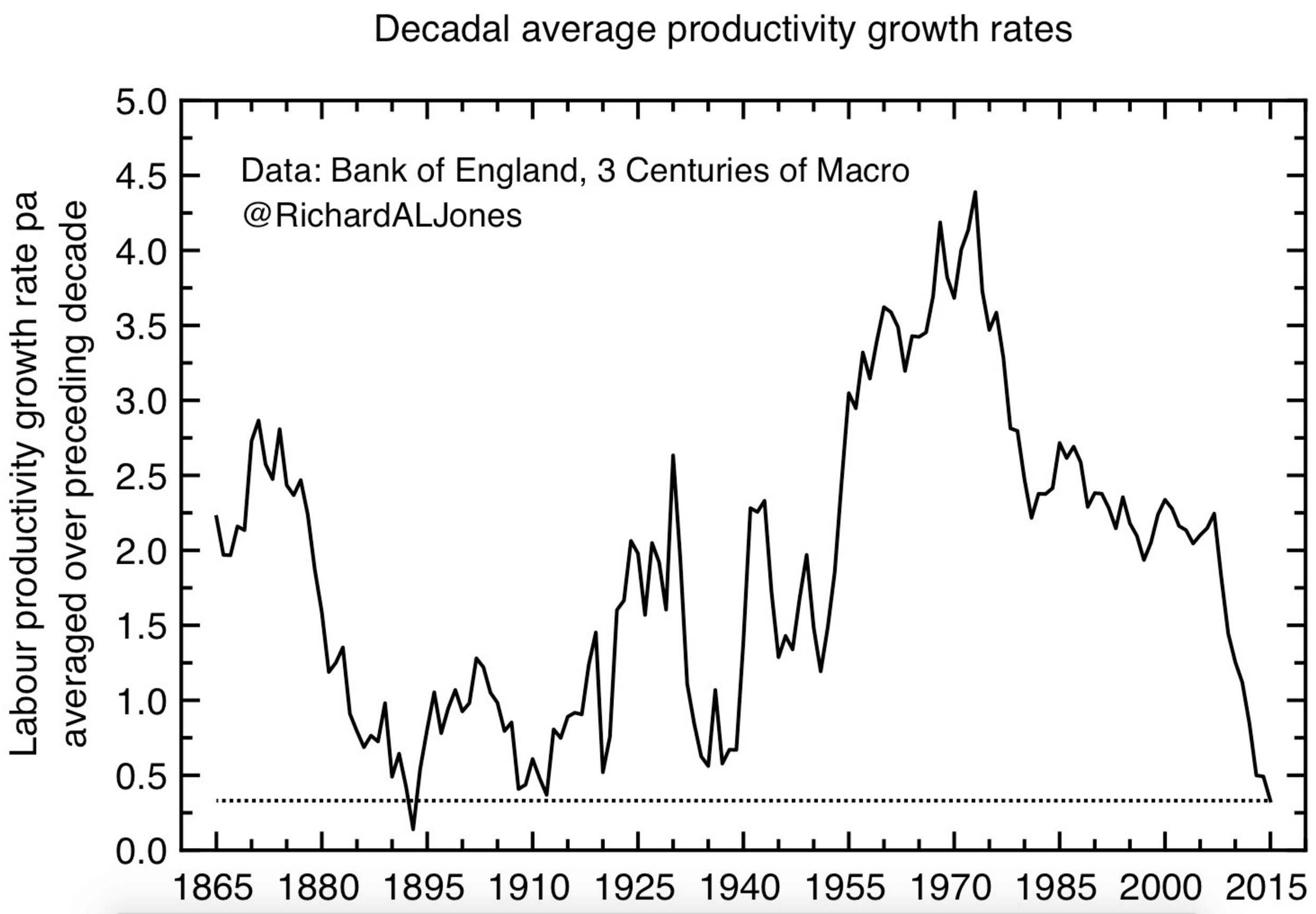 UK Productivity has grown less over the last ten years than over any previous decade since the late 19th century. Decadal average labour productivity growth, data from Thomas, R and Dimsdale, N (2016) “Three Centuries of Data – Version 2.3”, Bank of England