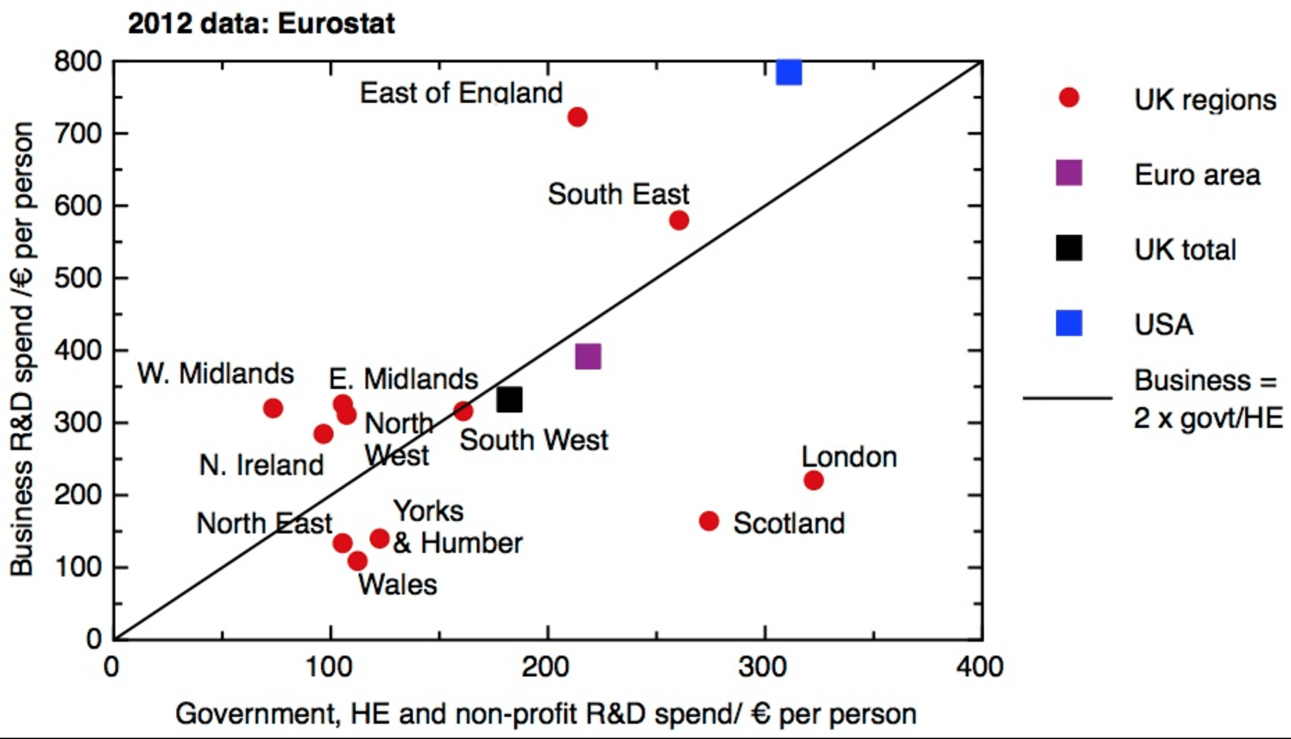 Business and government/higher education R&D in the UK by NUTS 2 regions. Data: Eurostat, updated 31/03/16