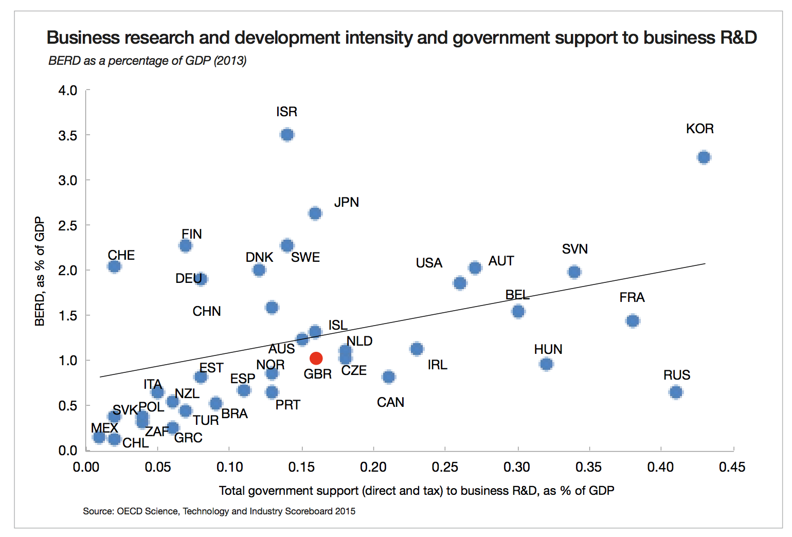 Between 2004 and 2014, business R&D intensity more or less flatlined, and now, in 2017, the new Green Paper reports that “business investment in R&D (BERD) is just over 1% of GDP in the UK, close to half the rate in Germany and substantially below the OECD average”. Whatever we’ve been doing up to now, it hasn’t worked.