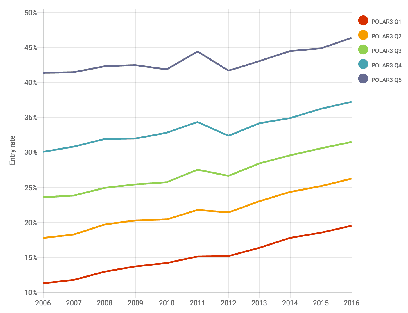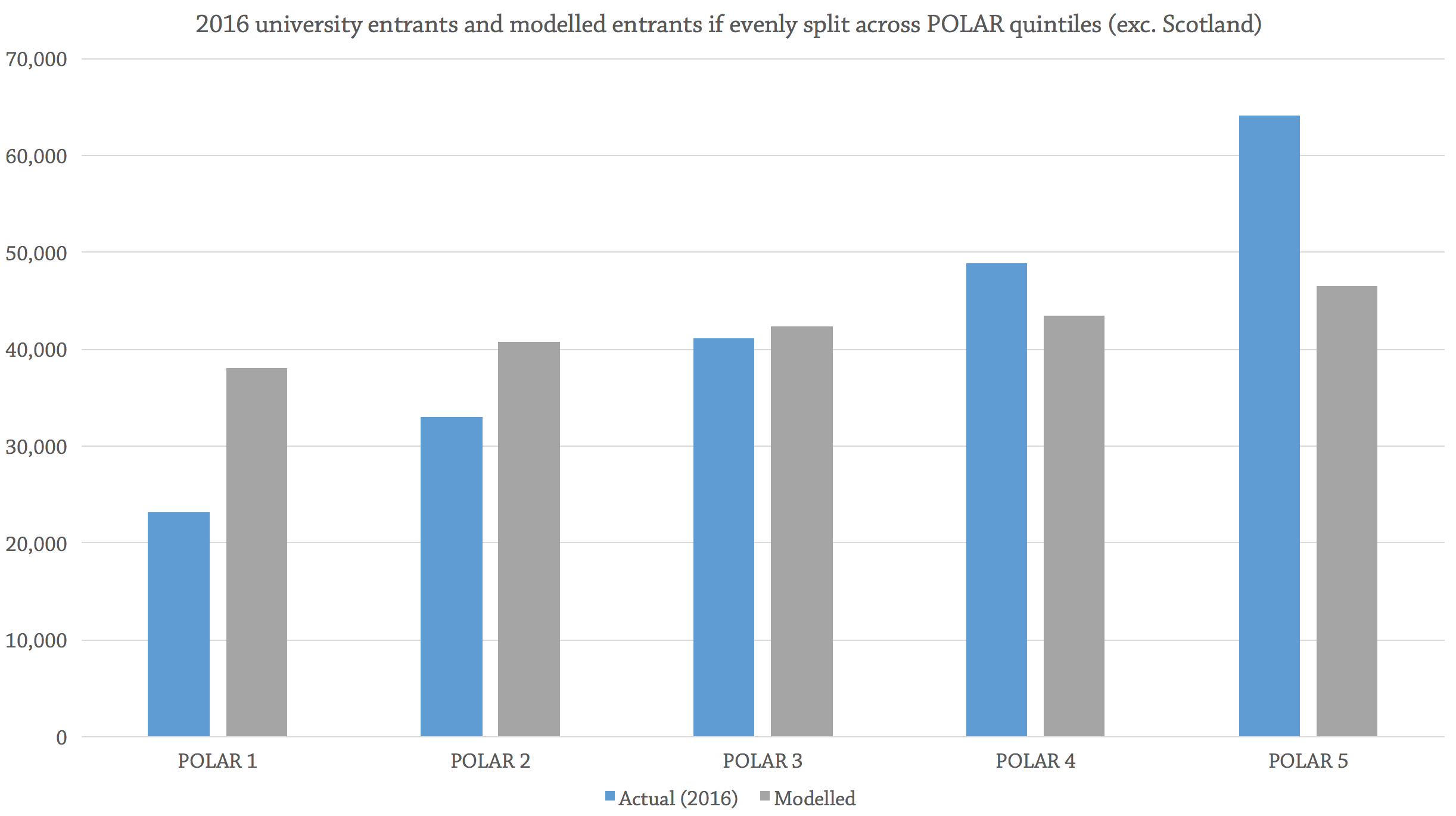 In our meritocratic educational utopia (or socialist hellscape, depending on your political outlook), pupils from POLAR Q1 backgrounds would have the same school attainment as those from POLAR Q5. The top attainers in this group would have the same aspirations across social class. And university admissions, being perfectly fair, would accept a fair proportion of applicants from each POLAR quintile relative to their entry tariff.