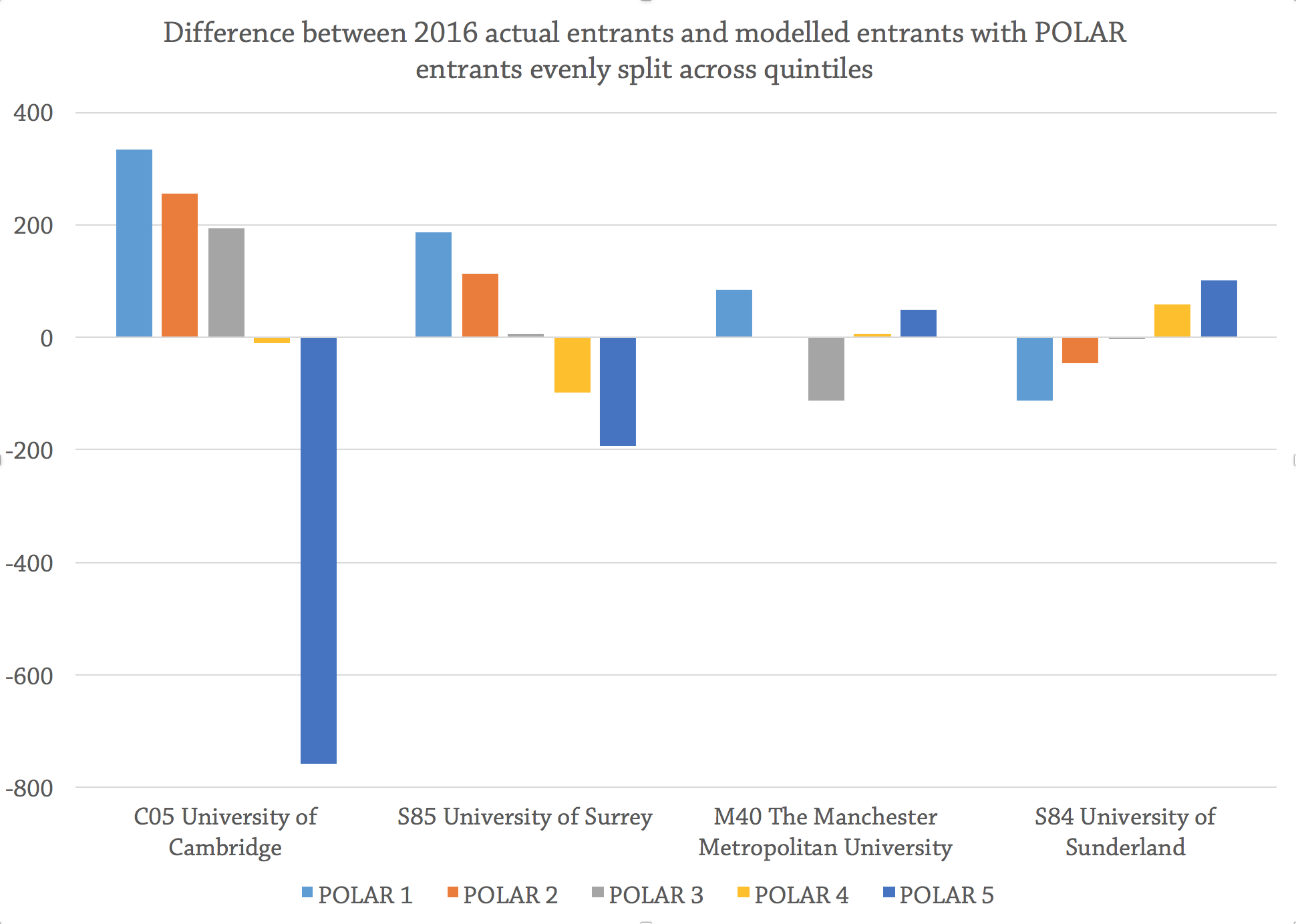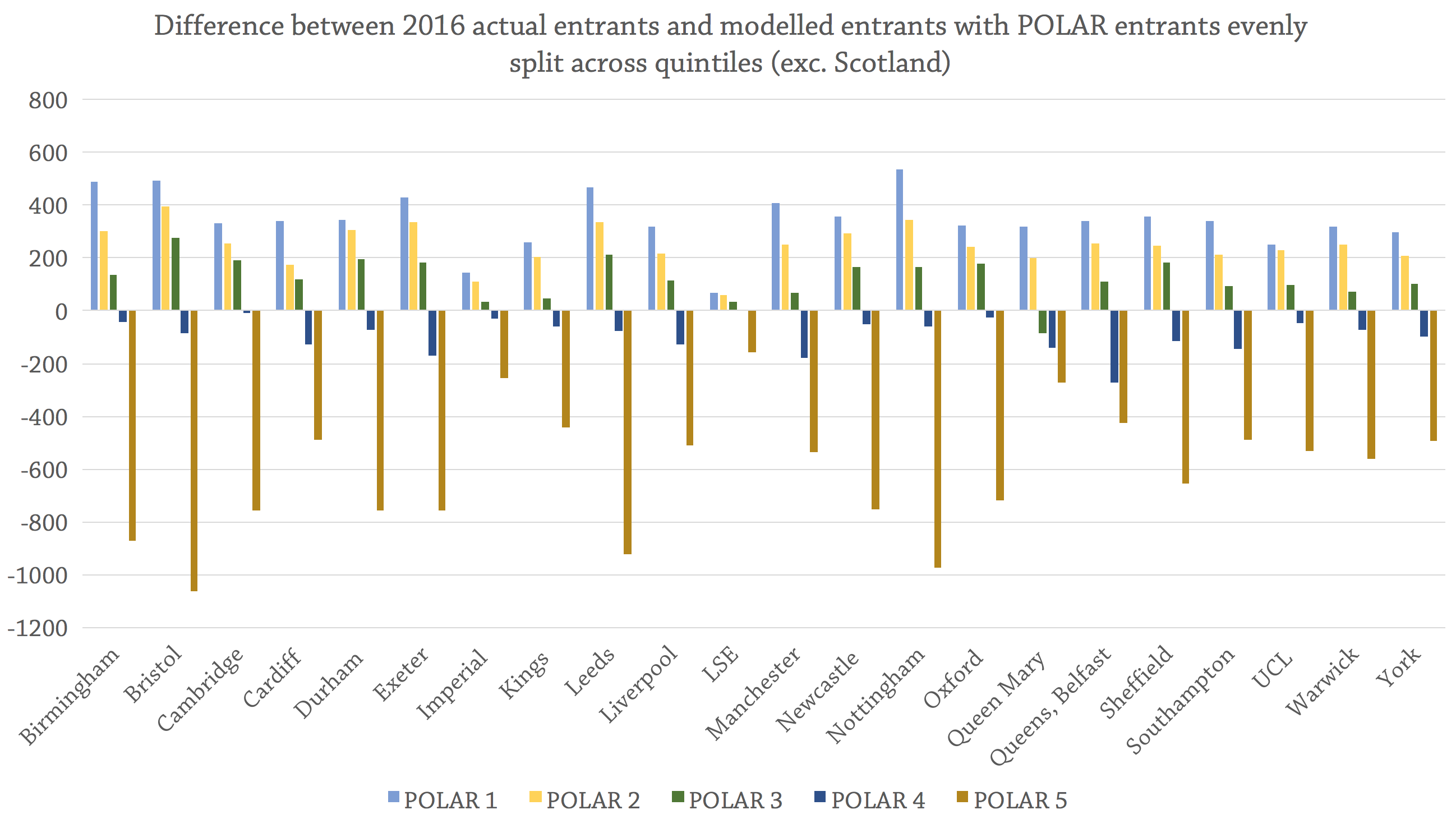 Yet that does not mean that there would be a profound affect on the admissions profiles of these institutions, particularly when it comes to the smaller numbers of POLAR Q5 entrants. Just look at all those downward pointing orange bars: that’s a lot of angry middle-class people deprived of a privilege they have gotten very used to.