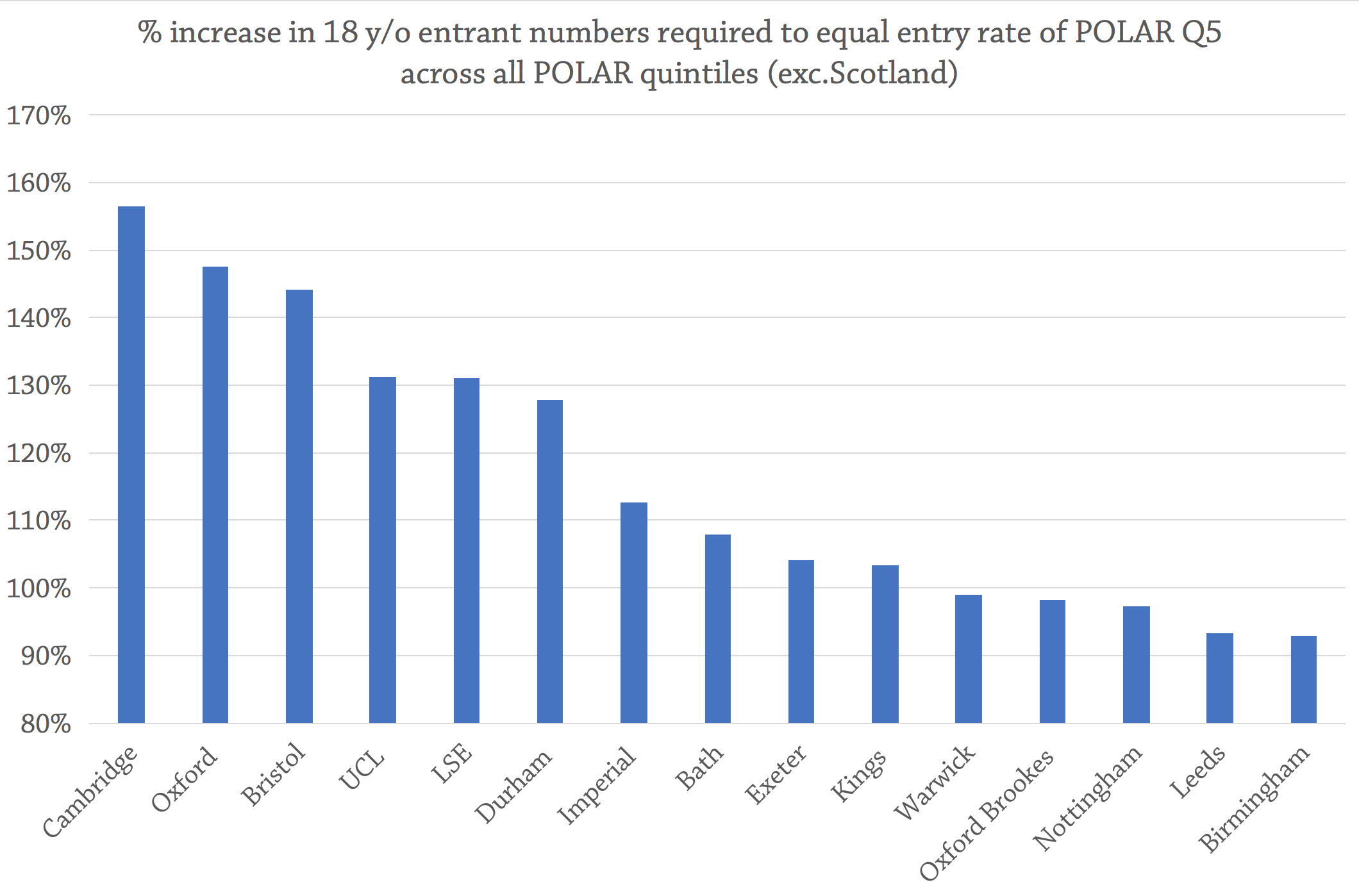 Thus the sector would need to create over 110,000 (!) additional places for new young entrants to meet the current deficit from POLAR Q1-Q4. That’s an astonishing increase, not only in numbers but in expense for the Treasury in student loan outlays and subsidies down the line. Broken down by institution, some universities would have to more than double their student intake to make their admissions ‘equal’ (using the term cautiously…) across socioeconomic backgrounds without cutting their intake of the most advantaged students. Oxford and Cambridge would require increases of roughly 150%. The kind of expansion at Oxbridge proposed by Nick Hillman as a means to widening participation while avoiding displacement will not even come close to equalising entry.