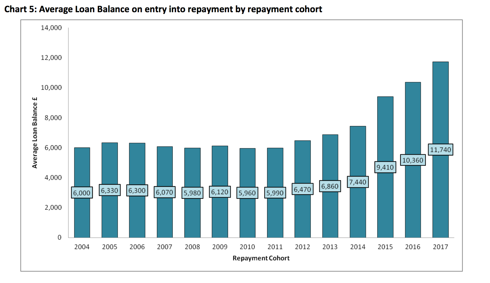 The rise since 2012 is due to the changes to student funding implemented in Scotland in 2013 still working their way through. Debt is being pushed up by the substitution of around one-third of the maintenance grant by loans, as well as an increase in the general use of loans to increase living cost support across the board, especially for those from middle-to-high income backgrounds. There’s potential for a further step up next year, when the first cohort on four year courses who have studied wholly under the 2013 reforms will have graduated.