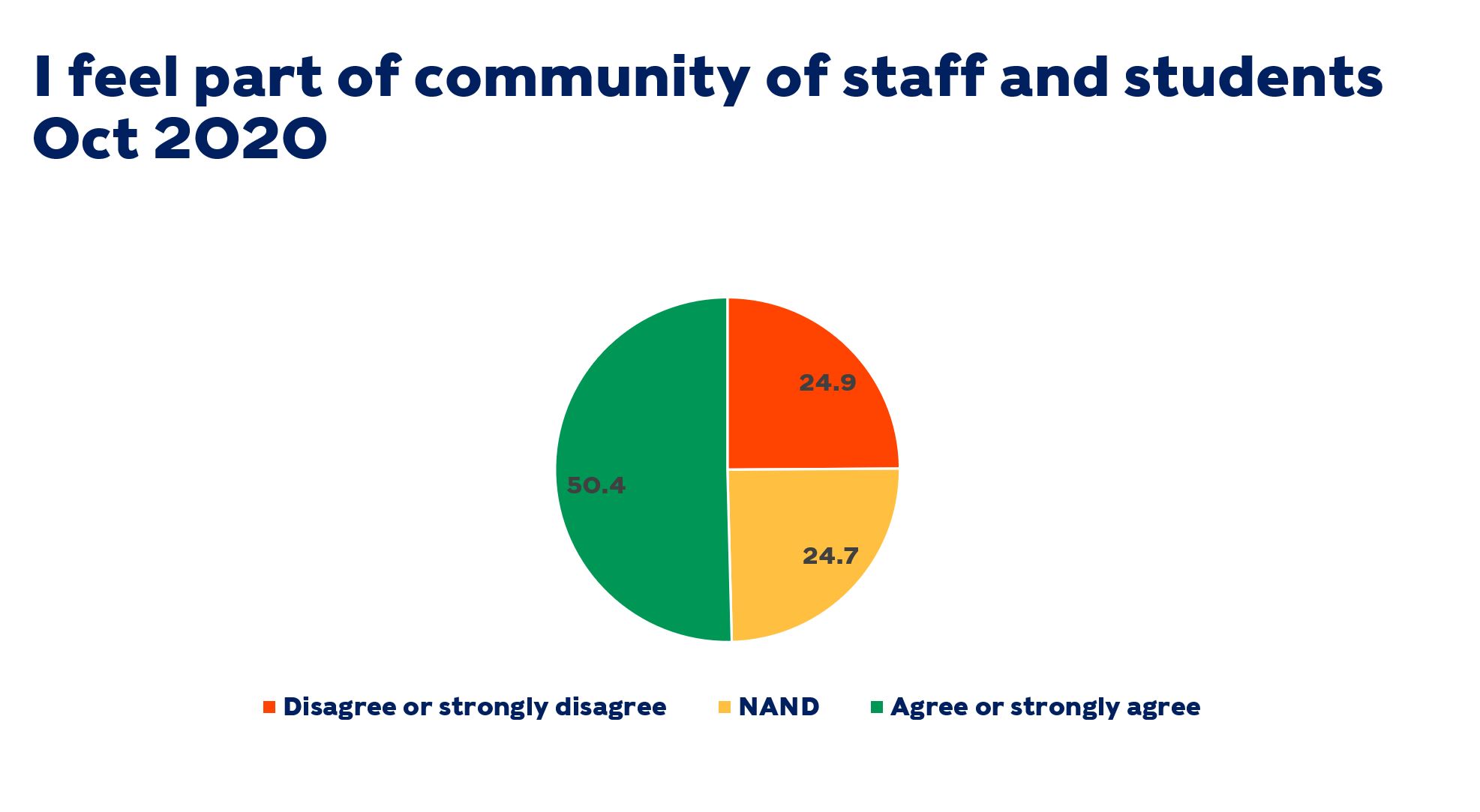 We know from our other research that belonging is crucial to academic success and staying the course, and our own research showed that students feeling part of a community (NSS question 21) is closely related to feelings of belonging, mental health perception and to outcomes confidence. So we asked the question again here, and again we saw a decline: