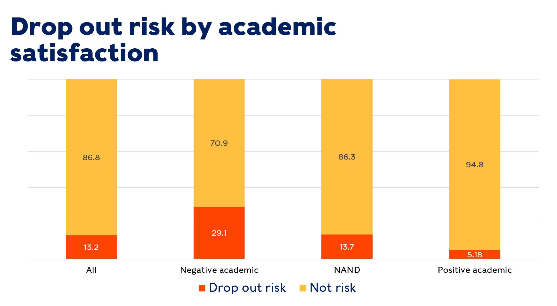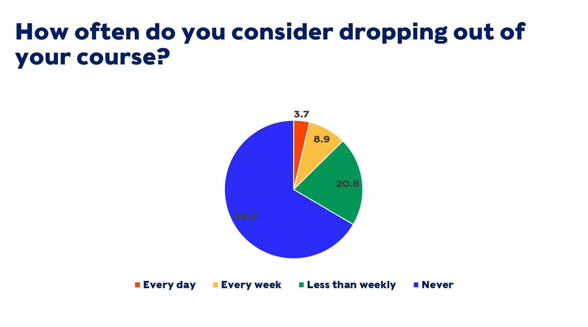 To identify who was most “at risk” of leaving their course, we divided respondents into those who said “every day” or “every week”, which we have called here “at risk”, and respondents who said “less than weekly” or “never”, and we have called that group here “not at risk”.
