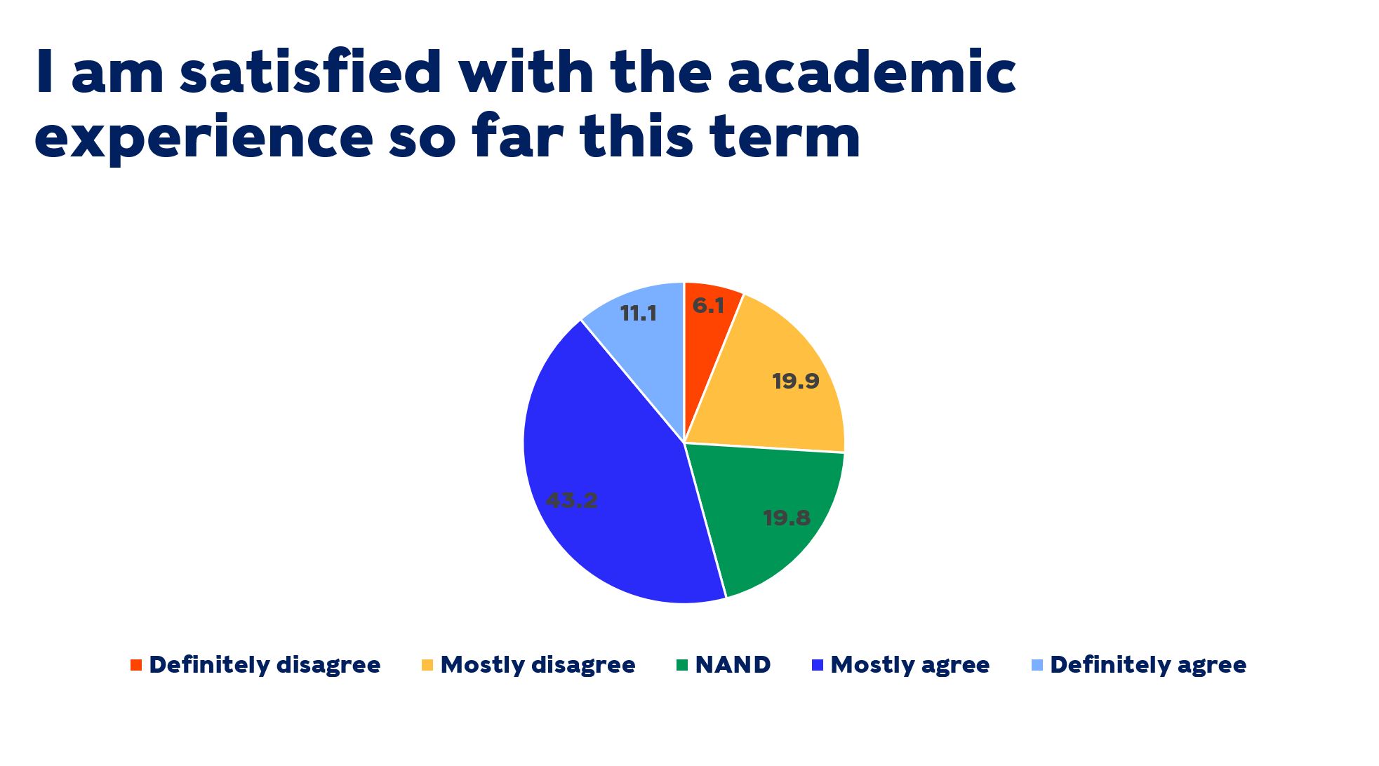 We also wanted to know about initial feelings of satisfaction with the academic experience. We might have reasonably expected early academic experience impressions to manifest in an increase in “neither agree nor disagree” – and one in five do respond in this way – but one in four actively disagrees:
