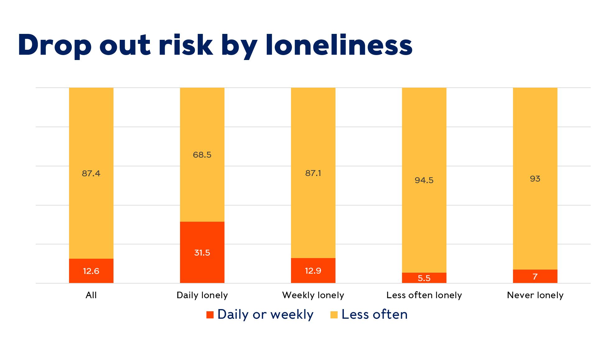 But perhaps more important are the findings on wellbeing and mental health. Over half of our sample report feeling lonely on a daily or weekly basis. Just 8.2 per cent report strong feelings of happiness, down from 14% before the pandemic and 32 per cent for young people pre-pandemic. And it is feeling part of a community and loneliness that are both strongly related to considering dropping out.