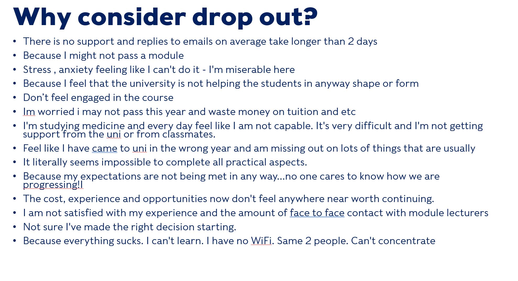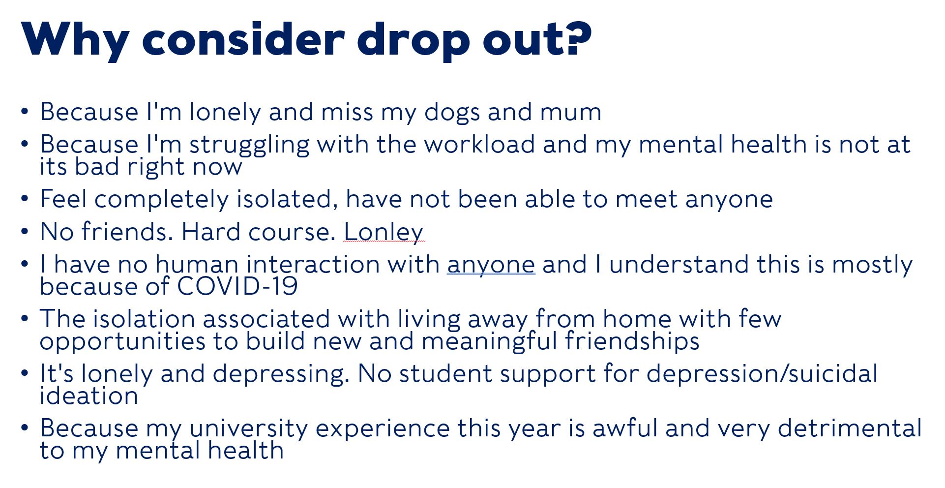In the qualitative feedback, we asked why students responded the way they did – and we looked particularly closely at comments from students that said they were considering dropping out “every day” to see if we could identify themes. It is hard to overstate how often isolation and loneliness came up: