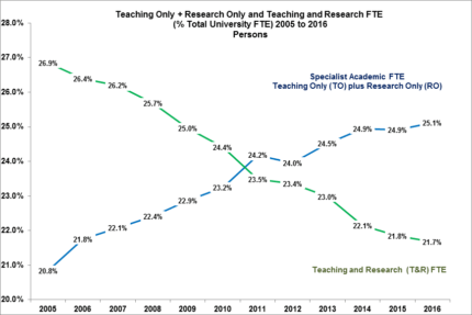 University staffing statistics show that in 2016 about eight out of ten (77%) of TO academic positions are casual and a similar proportion (78%) of RO academic are on limited term contracts. This raises the question as how much the increase in the use of specialist academic roles is being driven by the desire to achieve employment flexibility and cost savings.