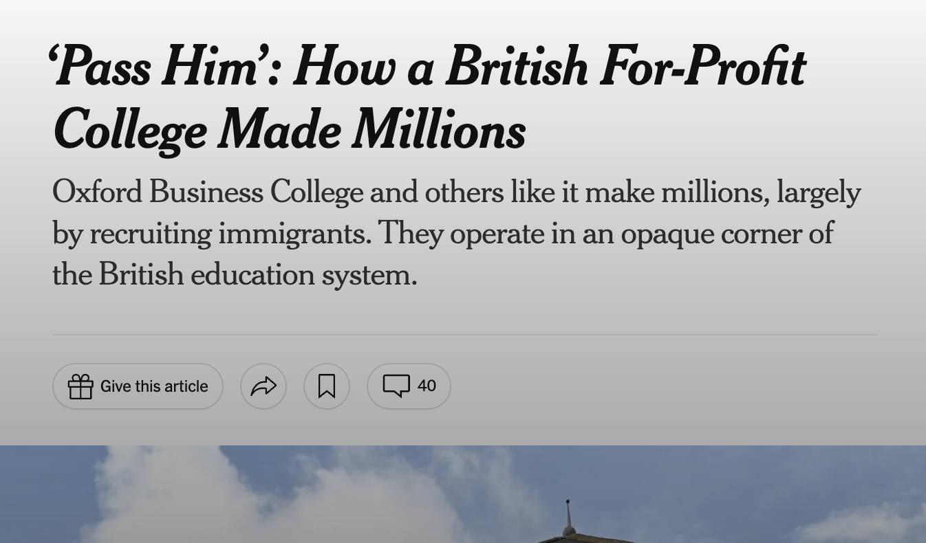 The Oxford Business College was the focus of a recent feature in the New York Times headlined “‘Pass Him’: How a British For-Profit College Made Millions.” The article said that the college and others like it “make millions, largely by recruiting immigrants,” noting that they operate “in an opaque corner of the British education system.”