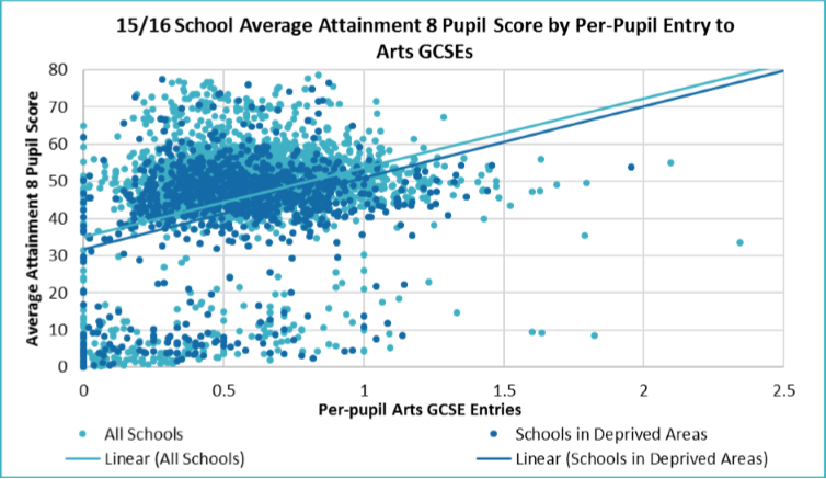 Figure 2: 2015/16 school average Attainment 8 pupil score by per-pupil entry to arts GCSEs