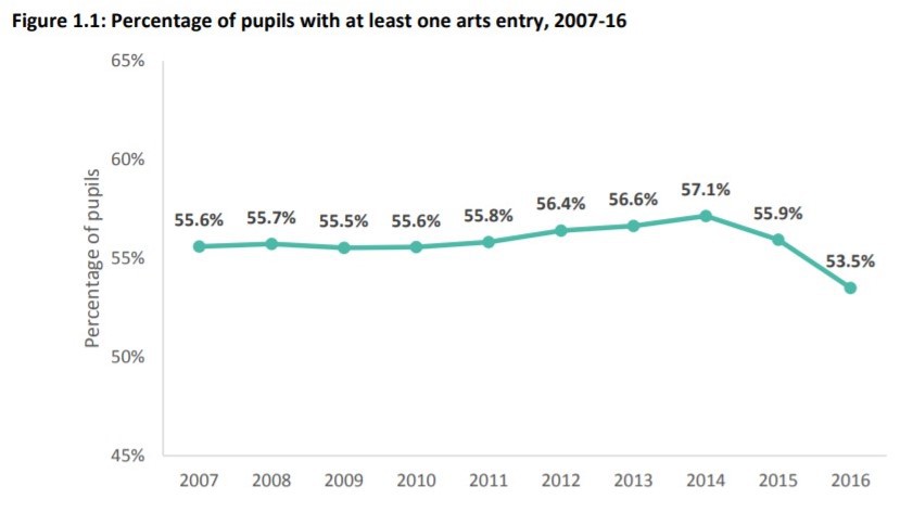 According to research by the Education Policy Institute (EPI), if the same proportion of sixteen-year-olds had taken at least one arts qualification in 2016 as in 2014, nearly 20,000 more pupils would have accessed an arts subject. This drop in numbers will have profound consequences for arts courses in English universities.