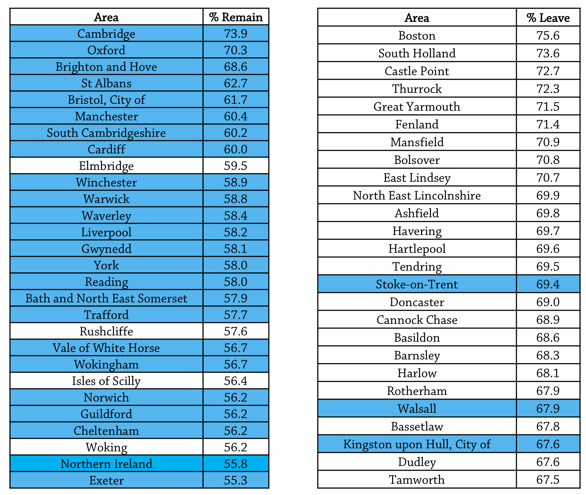 Highest % Remain and Leave votes by local authority area (exc. Scotland and London). Highlighted areas have a university presence.