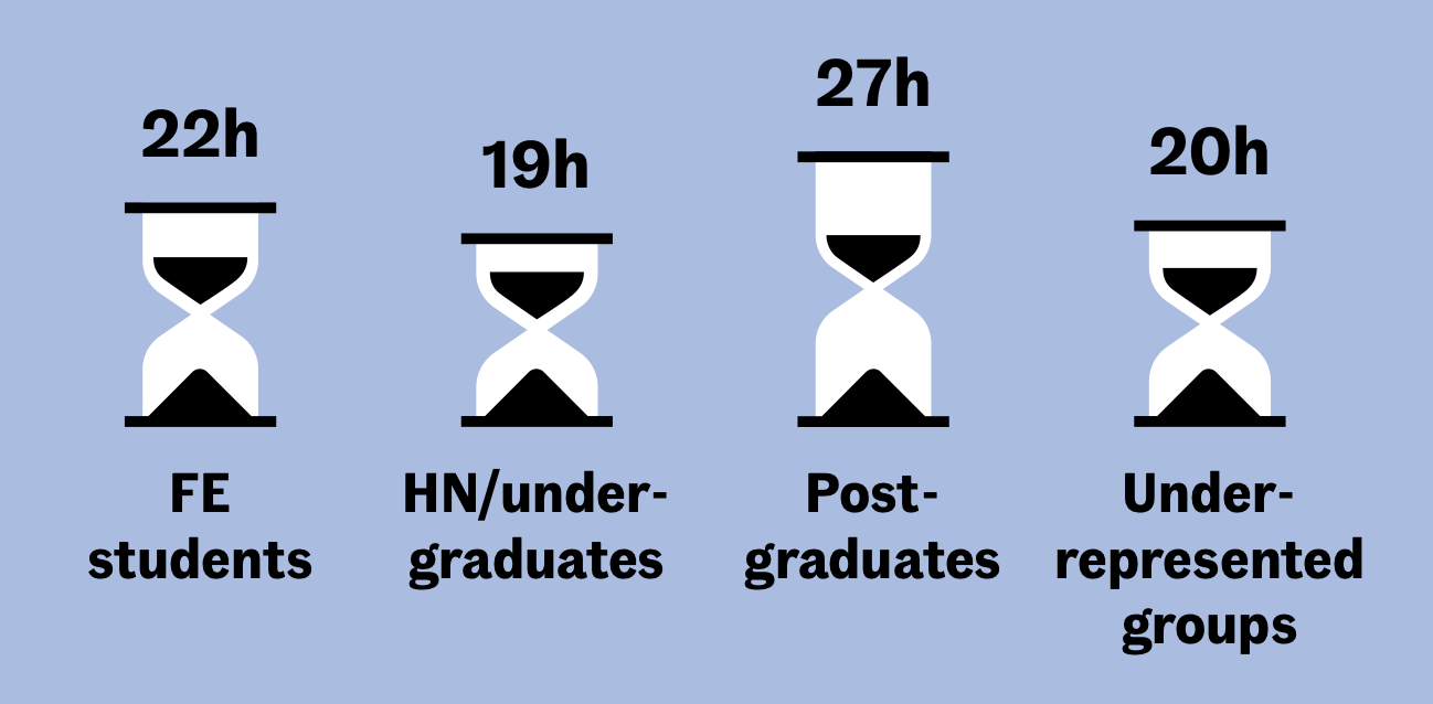 The report reminds us that the Cubie Commission (1999) recommended students work no more than 10 hours per week alongside studying, the Student Information Scotland website suggests students work 10-15 hours per week, and 2017’s Independent Review of Financial Support for Students supported Cubie’s recommendation of ideally limiting work to 10 hours per week during term time.