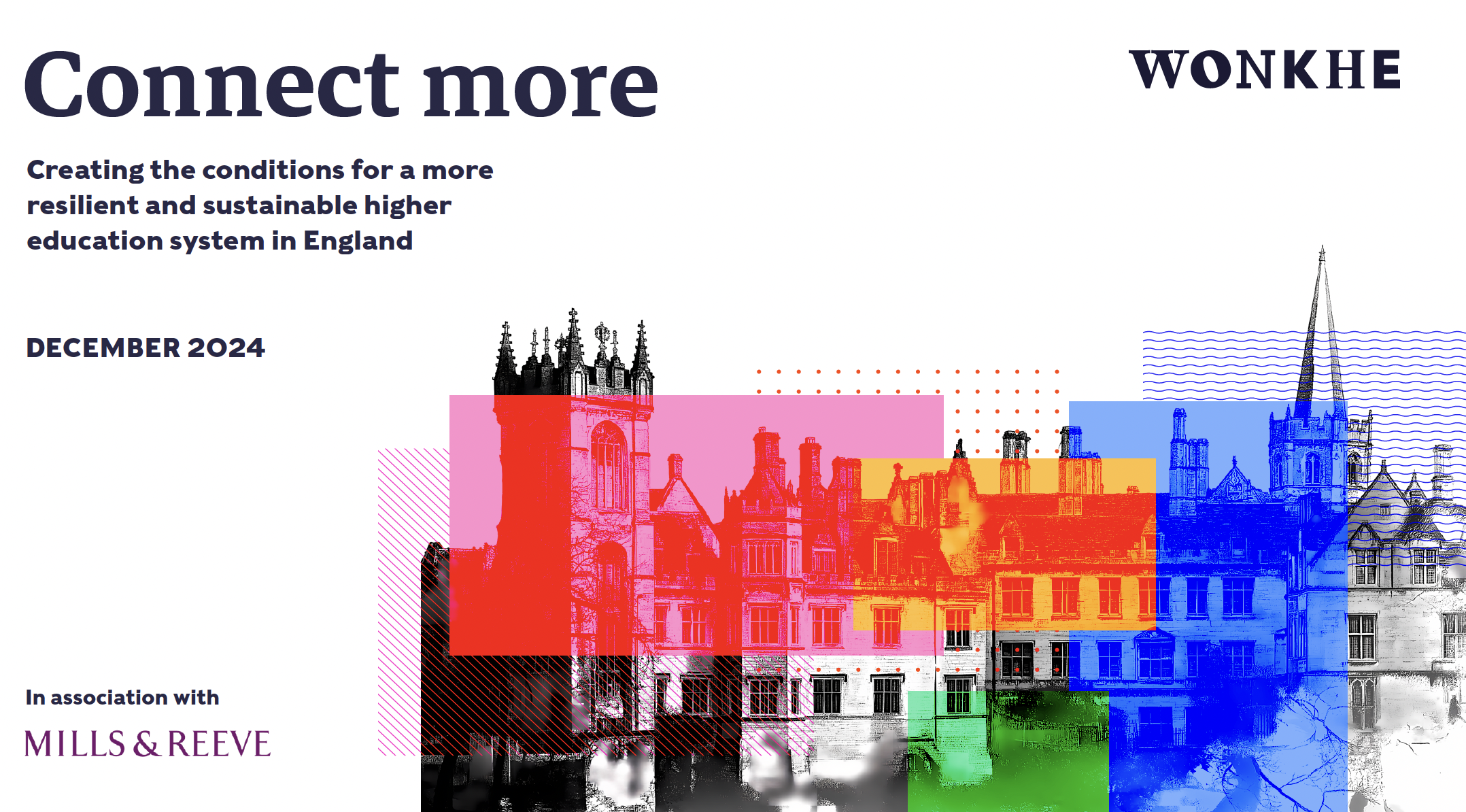 In the autumn of 2024, Wonkhe and Mills & Reeve convened a number of private and confidential conversations with heads of institution, stakeholders from the sector’s representative bodies, mission groups, and regional networks, Board chairs, and a lender to the sector. We wanted to test the sector’s appetite for structural change; in the first instance assessing providers’ appetite for stepping in to support another provider struggling, but also attitudes to merger and other forms of strategic collaboration short of full merger. Our report, Connect more: creating the conditions for a more resilient and sustainable higher education system in England sets out our full findings and recommendations.