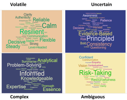 The response was then mapped onto a 2 x 2 matrix with axes defining “what you know” versus the “outcomes/forecasts of your actions”. The most frequent word per category is shown in italics. For UK HE, read: Volatility = Resilient, Uncertainty = Principled, Complexity = Informed, Ambiguity = Risk-taking. For comparison, words in brackets have been proposed as most relevant to the (pre Covid-19) corporate world.