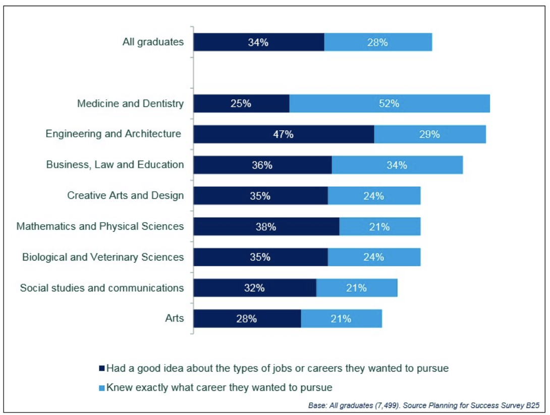The Department for Education’s Planning for Success research report found that students that had a clear career plan were significantly more likely to secure professional employment. However, it should be noted that many of the students with a clear career plan were in the disciplines that do traditionally lead to linear career outcomes such as medicine, engineering and education: