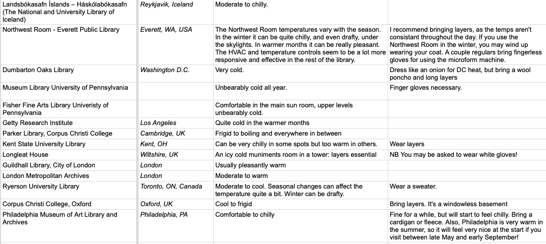 The society brings together 60-some scholars of rare books and material texts from a variety of disciplinary or institutional approaches, she said, “so collectively, we’ve all spent quite a bit of time in libraries of various climates all over the world.” In addition to library temperatures, lighting and even humidity levels, the scholars trade research destinations’ photo policies and nearby eateries and drinking holes, among other tips. A spreadsheet opens up that resource to others, Sperling said. The document already has dozens of entries, from the U.S. to South America and Europe.