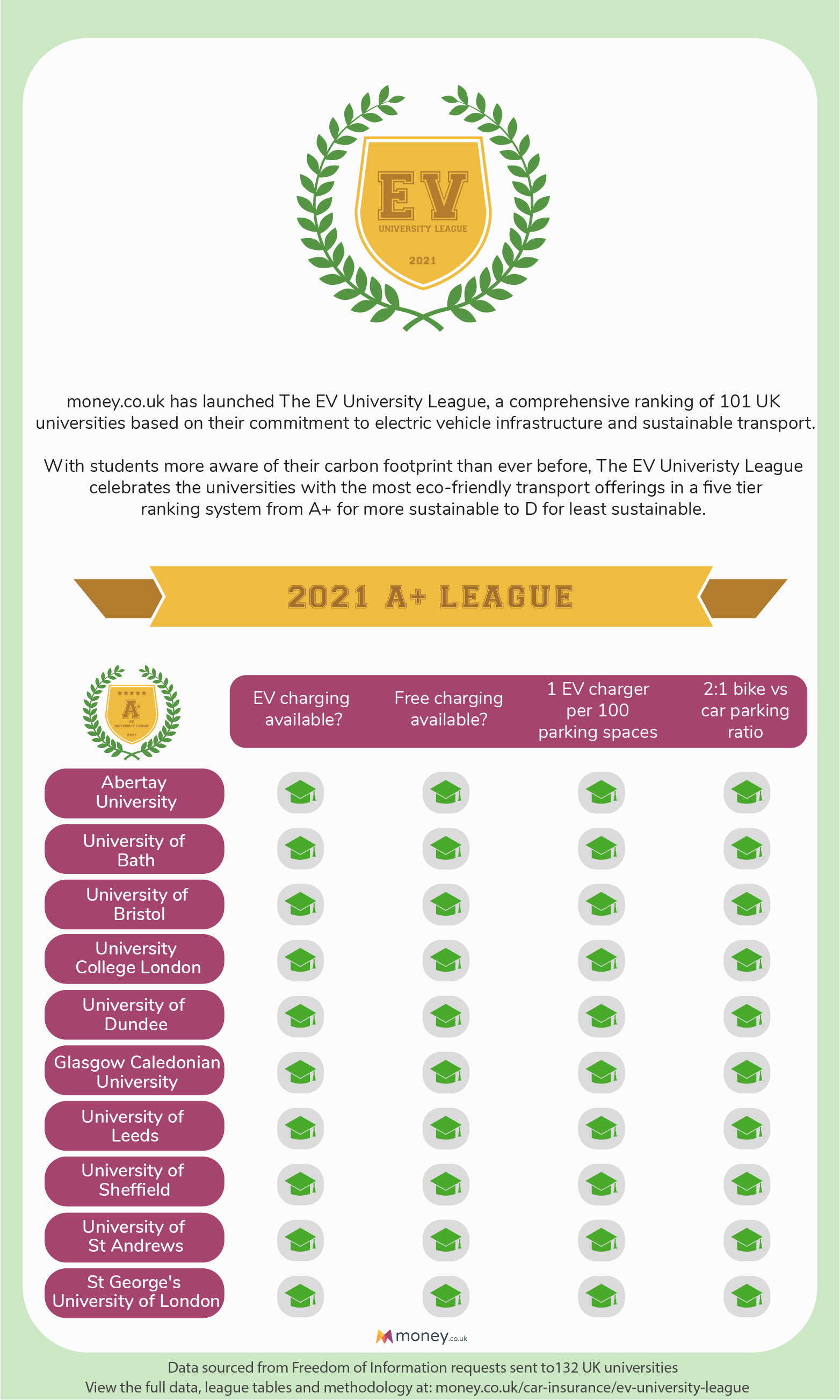 Over a period of two months, money.co.uk submitted Freedom of Information requests to 130 UK universities, asking them about their current infrastructure for EV vehicles and sustainable transport.