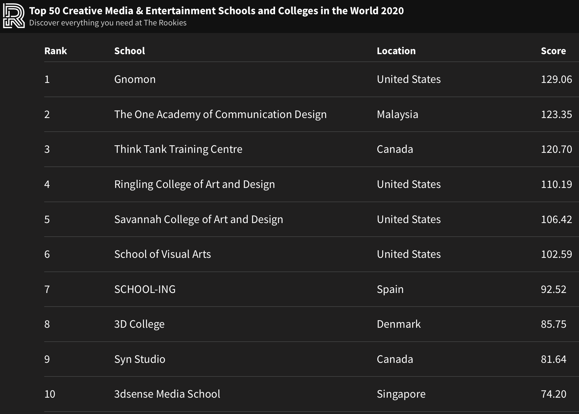 Next up is one I’ve not seen before, it’s “The Rookies” – a ranking which claims to identify the Top 50 creative media and entertainment schools and colleges in the world for 2020. Reassuringly, they take this “very seriously and no external influences or payments are entered into at any point”. Rather: