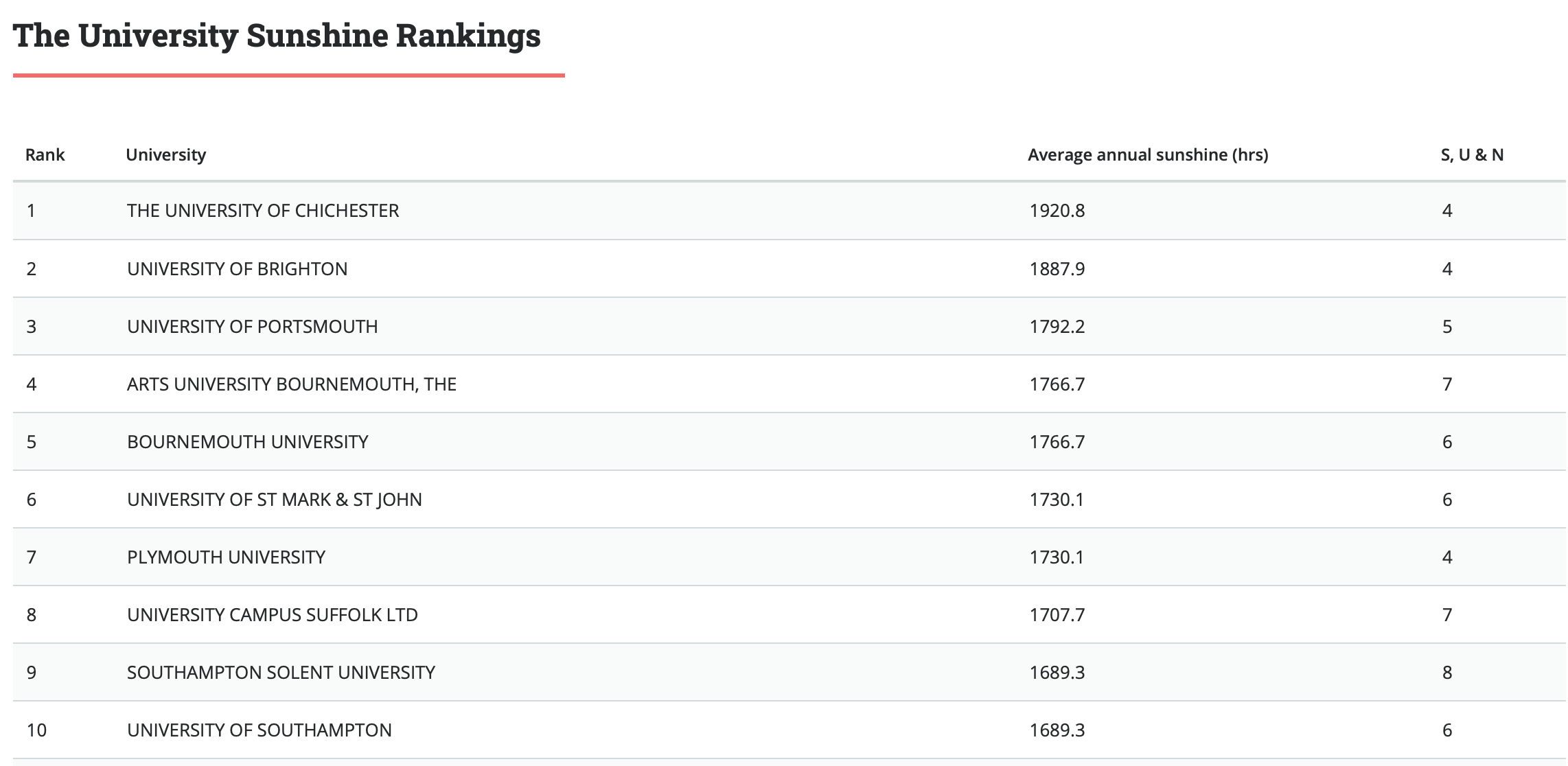 The rankings are based on two key metrics: average annual sunshine (source: Met Office, nearest climate station), and the number of the letters S, U and N in the university’s name. These metrics are weighted 99% and 1% towards the final ranking. The rankings are based on main campus postcodes only.